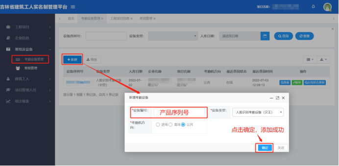 1、将考勤设备SN码(产品序列号)填写到实名制平台[考勤设备管理]。左侧菜单[班组及设备]->[考勤设备管理],在[考勤设备管理]页面点击[新建]按钮,在弹出的[新增考勤设备]页面中填写信息。