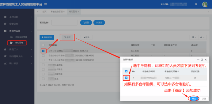 注意:如果有多台考勤设备,一个班组可以选中多个考勤设备。需要将每个班组都[修改]一次,添加新的考勤设备。
