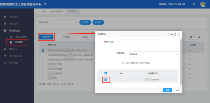 3、新添加班组时选中考勤设备。将全部考勤设备选中后,此班组的人员信息将会下发到全部考勤设备中。