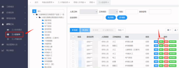 第一步:进入【工人进退场】或【管理人员进退场】,选择需要修改的人员,点击【修改】按钮,进入修改页面。