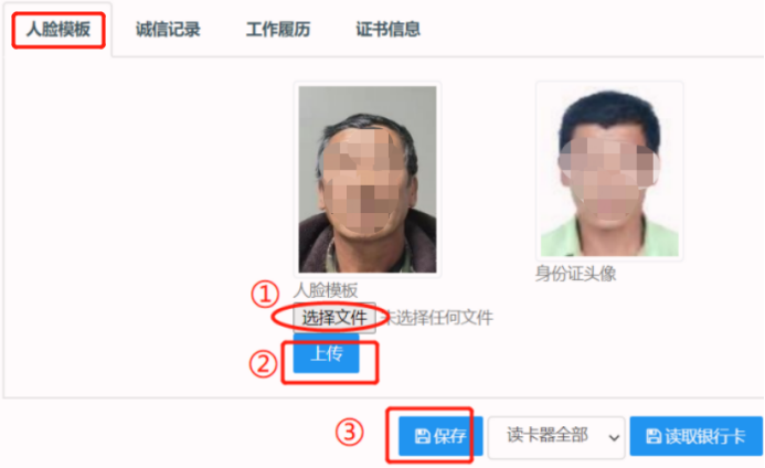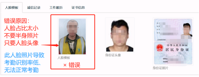 解答:需要在实名制系统中,【工人进退场】或【管理人员进退场】修改此人的人脸模板照片。建议新录入人员信息时,同时上传目前最新本人的人脸照片,身份证照片分辨率低,导致考勤机识别率低,出现无法识别的现象。