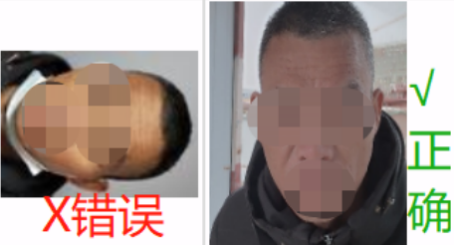 3、拍照时要拍摄人脸正面照片,不要拍人脸侧面照片(或斜下方拍摄),照相机要与鼻子在一条水平直线,让两个眼睛、鼻子、嘴在一个平面,并且无任何遮挡。